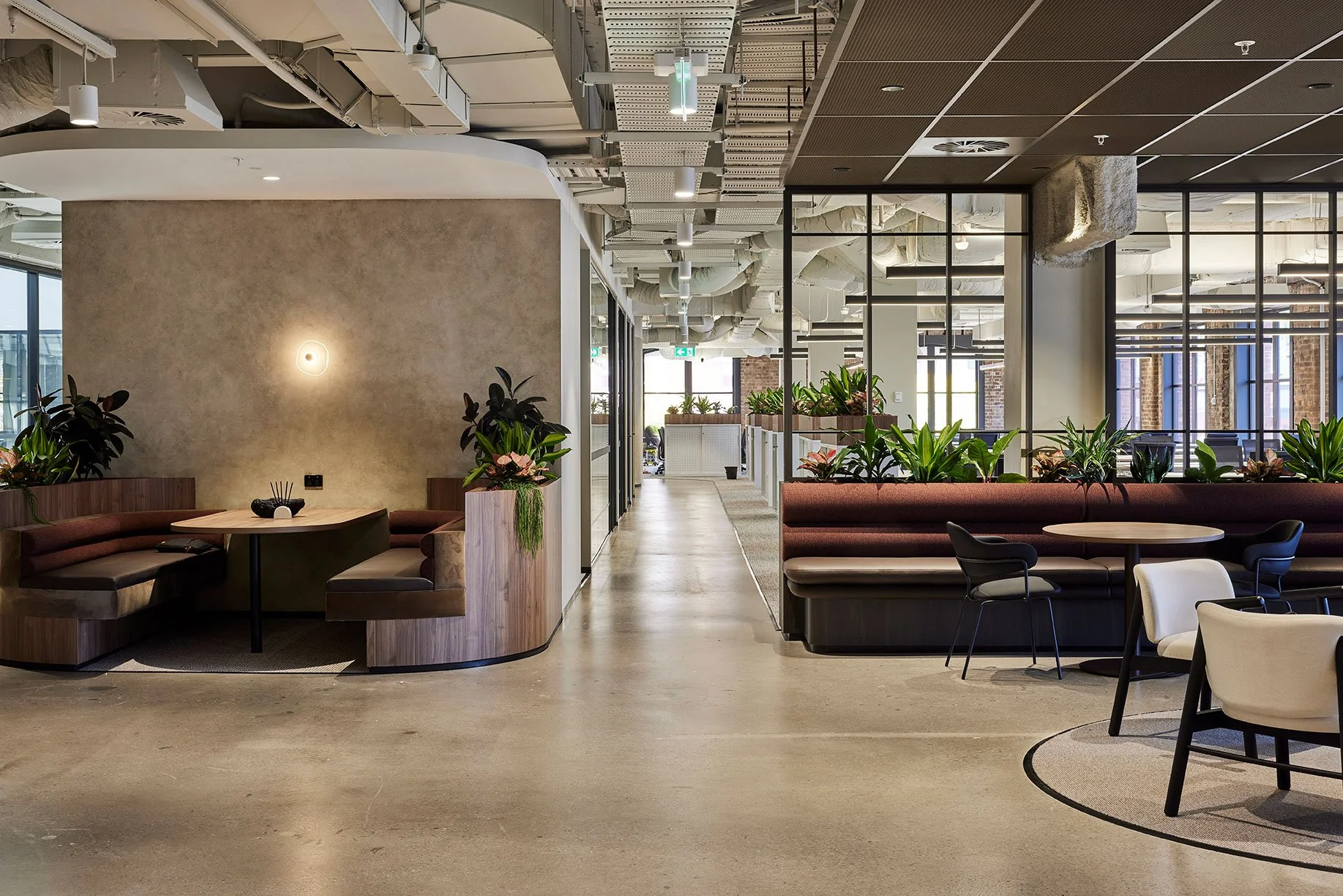 Feature timber slatted ceilings in arrival, breakout and collaboration zones